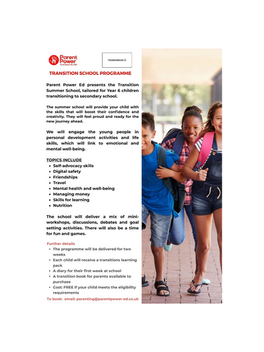 Parent Power Ed’s Transition Summer School supports Year 6 pupils as they prepare for secondary school. The programme blends interactive workshops, discussions, and fun activities to help children build confidence, resilience, and key life skills.